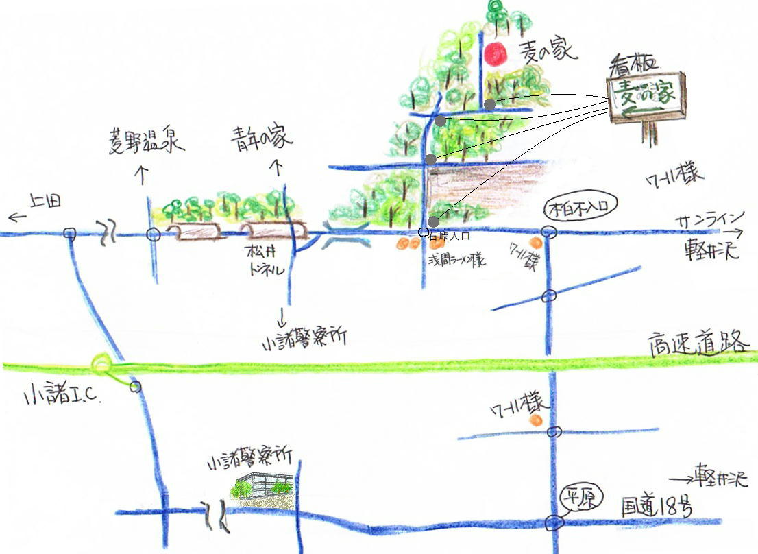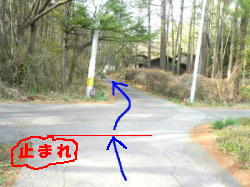 浅間サンラインを軽井沢方面から来たところです。”柏木入口”という交差点を通りすぎて 600 m、左に浅間ラーメン様があり、すぐその先の小さな交差点”石峠入口”を右に入ります。 |