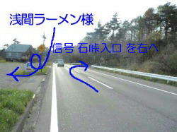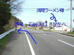 浅間サンラインを上田方面から来たところです。浅間ラーメン様のすぐ手前の小さな交差点”石峠入口”を左に入ります。 |