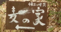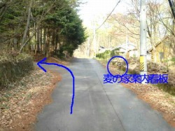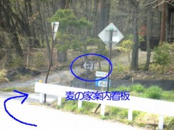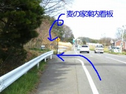 交差点の角に小さいですが焦げ茶色の麦の家の案内看板があります。 |